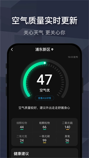 2. 实时监测:可实时查看空气质量,包括PM2.5等6项空气质量指数,还能逐时查看24小时天气情况。
