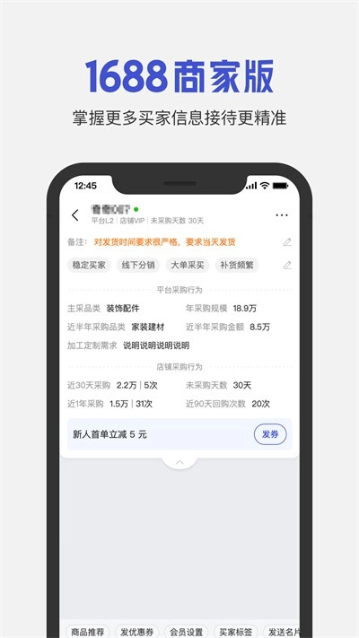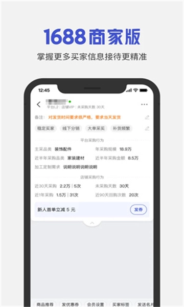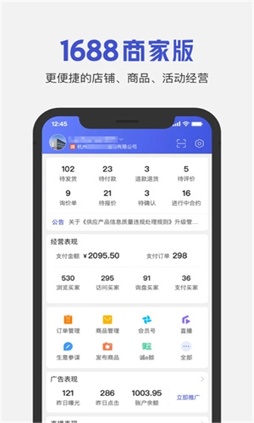 1688商家版是一款商家后台管理软件,用户可以使用这款软件来查看与了解店铺的日常经营信息,管理商品的库存,自由调整数量,还可以对订单进行管理,了解货物的物流位置,还提供了当前店铺的经营数据,了解收益等信息,还可以在线与顾客进行交流,促进单量的提升,还可以用来接收的信息,这款软件功能丰富且实用,为你的创业之旅增添助力。
