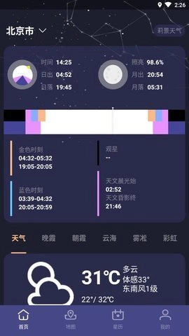 若想获取更具体的信息,可通过底部导航栏找到地图入口,进入地图界面后,把地图类型切换为云图模式,就能查看周边云量的分布情况,还有不同时段的云量数据以及云层高度等信息。