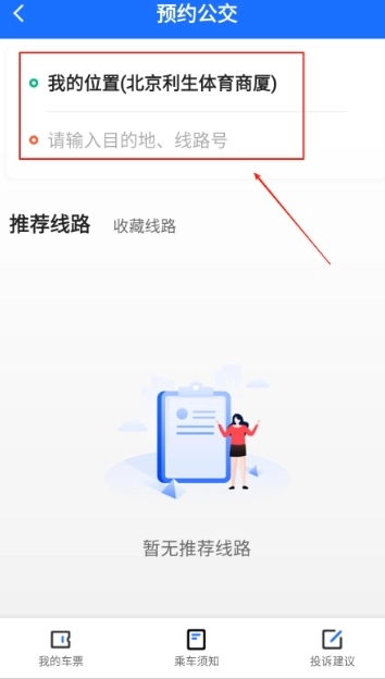 进入预约公交页面后,点击屏幕中间显示“请输入目的地、路线号”的输入框,接着输入你计划前往的具体目的地。