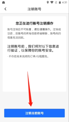 点击“注销账号”选项后,系统将呈现注销账号的相关说明。请认真阅读并确认信息准确无误后,点击页面底部的“注销当前账号”按钮。