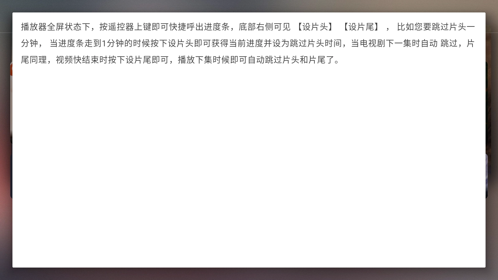 在播放器全屏模式下,按遥控器上键能快速调出进度条,此时底部右侧会显示【设片头】和【设片尾】按钮。若想跳过一分钟的片头,只需在进度条走到1分钟位置时按下【设片头】,系统就会记录当前进度并设为片头跳过时间,下一集播放时会自动跳过该部分;片尾设置同理,在视频快结束时按下【设片尾】,后续播放下一集时,片头和片尾就都会自动跳过了。