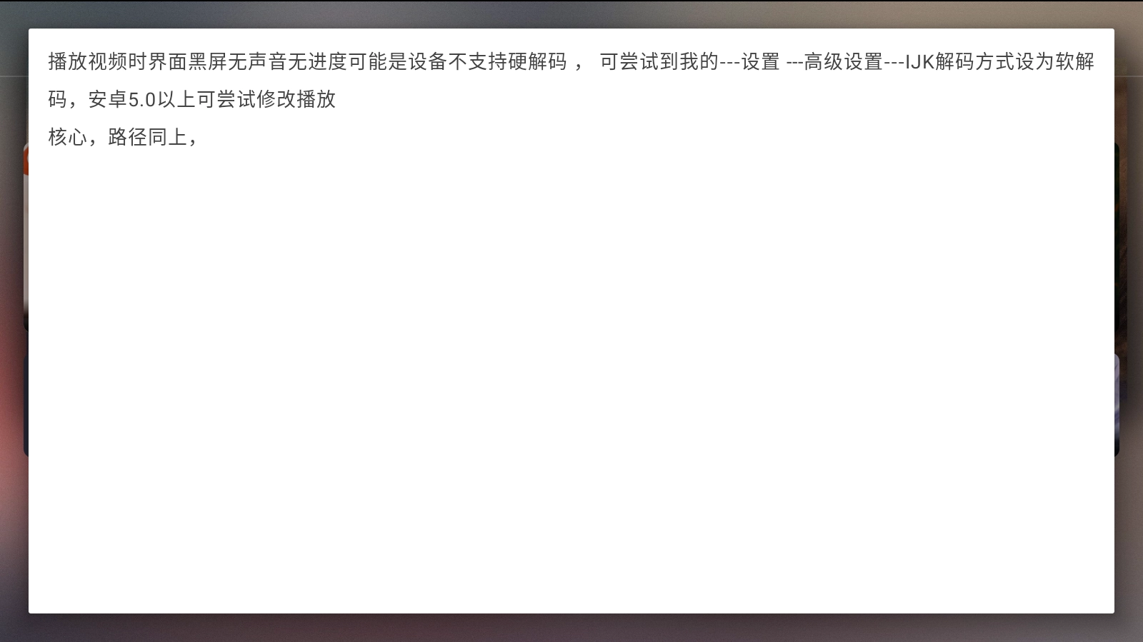 播放视频时若出现界面黑屏、无声音且进度条无变化的情况,可能是设备不支持硬解码导致的。您可以尝试进入“我的”页面,依次点击“设置”-“高级设置”-“JK解码方式”,将其调整为软解码。如果您的设备系统是安卓5.0及以上版本,还可以尝试修改播放核心,操作路径与上述相同。