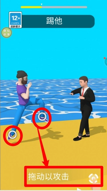 按照画面里“踢他”的提示,拖动腿部图标就能完成踢击动作啦。