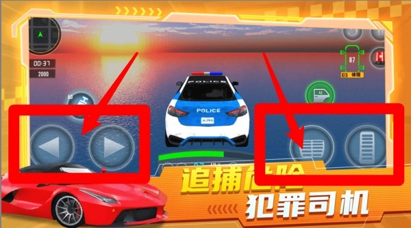 警车的转向由左侧方向键控制,右侧按钮则负责加速、刹车以及警笛鸣响的操作。