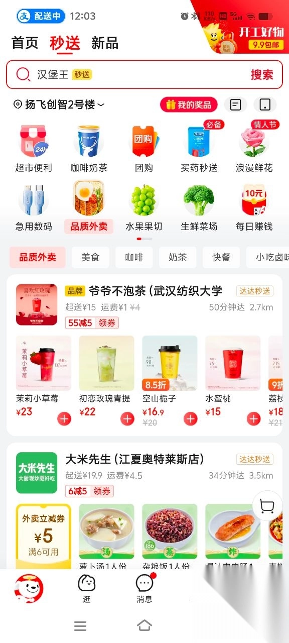 澎湃新闻在京东平台发现,“秒送”频道已正式推出,该频道设有“外卖”板块,覆盖了美食、咖啡、奶茶、快餐、小吃卤味等多种品类,而配送服务主要由京东旗下的达达公司承担。