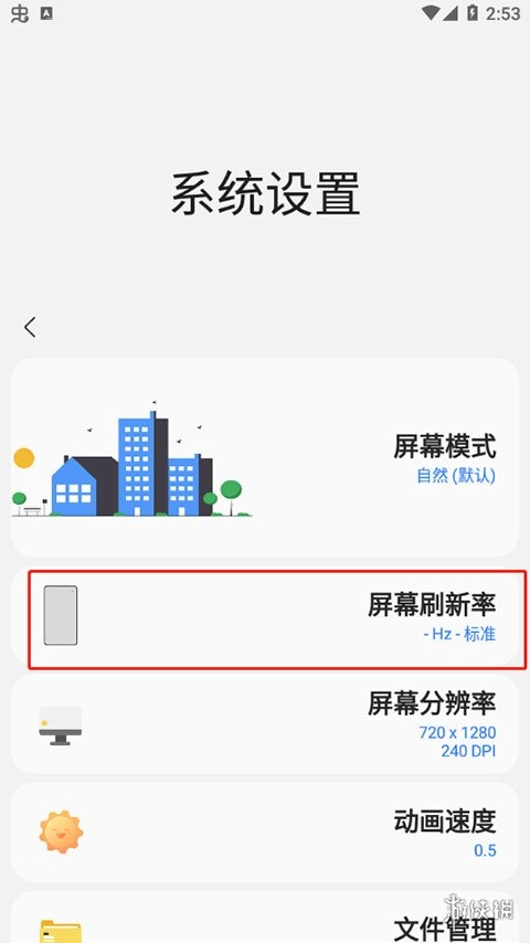 回到SamHelper应用,接着点击系统设置选项,之后依次选择屏幕刷新率和自定义选项。