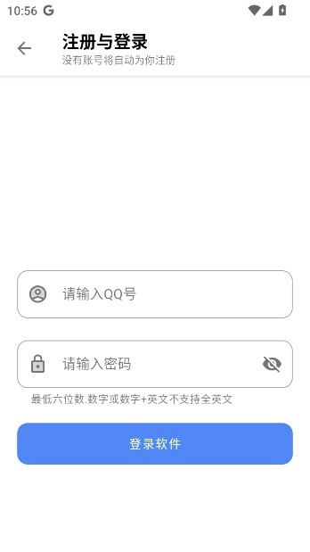 进入账号创建界面后,依次填写用户昵称、QQ数字账号及登录密码,最后点击界面上的注册按钮完成操作。