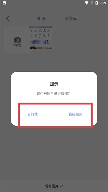 选图后会弹出提示,你可以根据需要点击【去剪裁】进行编辑,或者点击【直接使用】进入下一步操作。