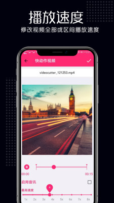 专业的视频剪辑app,提供有丰富的视频特效功能,用户在线可以轻松的实现视频的参数调节或是添加上转场特效,满足不同用户的需求!