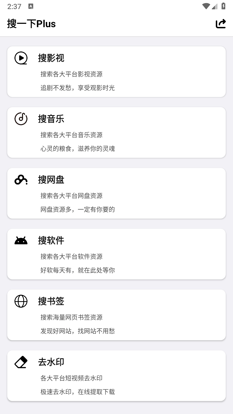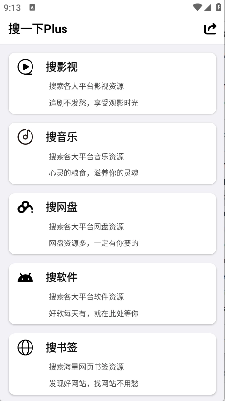 启动搜一下Plus应用,进入主界面后,就能看到影视搜索、音乐搜索、网盘搜索、软件搜索、书签搜索等功能选项。