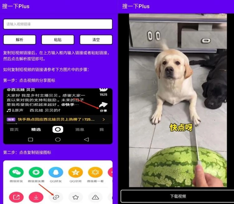 获取短视频的分享链接后,把它填入页面顶部的输入区域(可以手动输入也可以直接粘贴),接着点击“解析”按钮就完成操作了。