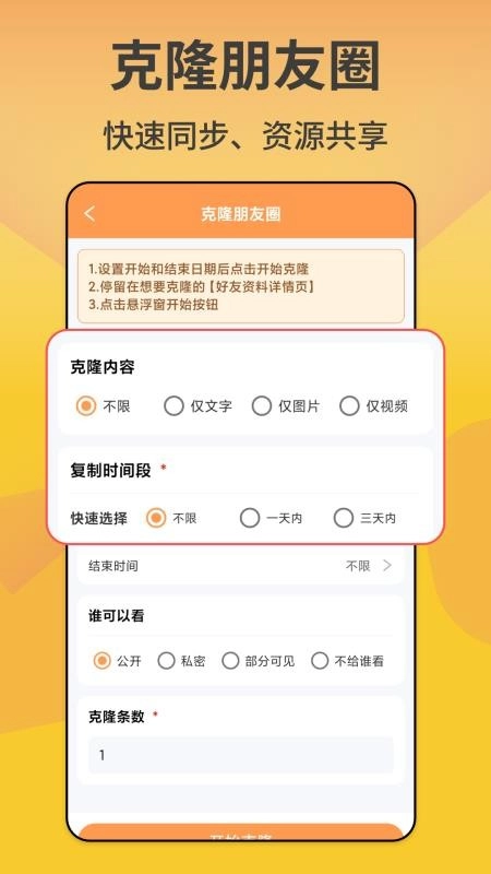 根据实际需求,还能实时克隆对应的朋友圈内容,助你一键复制所需的朋友圈并完成发布,实现快捷分享。