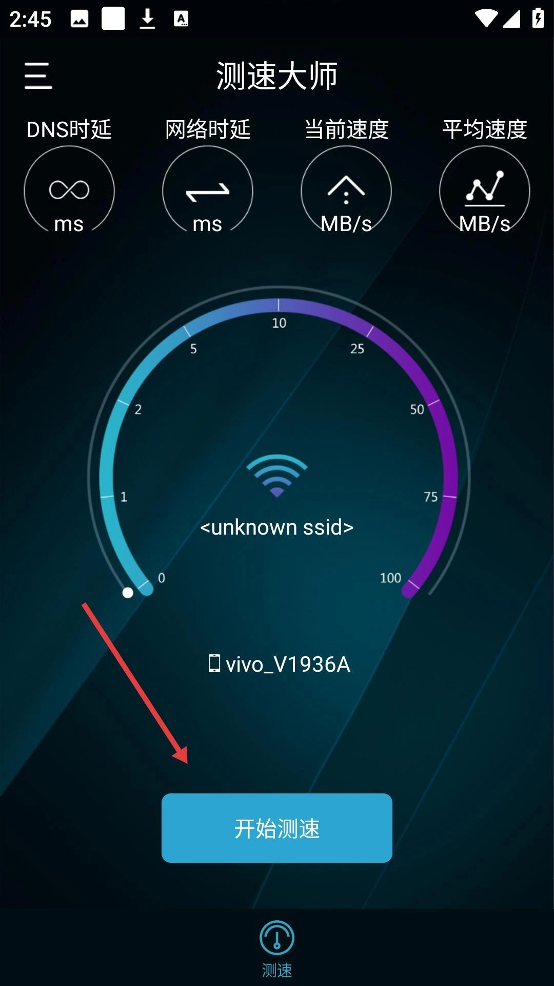 打开测速大师应用后,点击“开始测速”按钮,系统便会自动启动网络性能检测流程,期间DNS时延、网络时延以及实时网速等关键数据都会动态呈现出来。