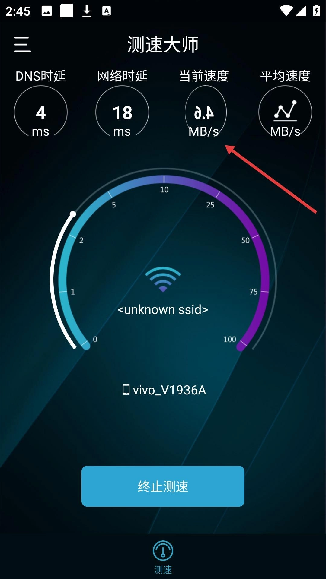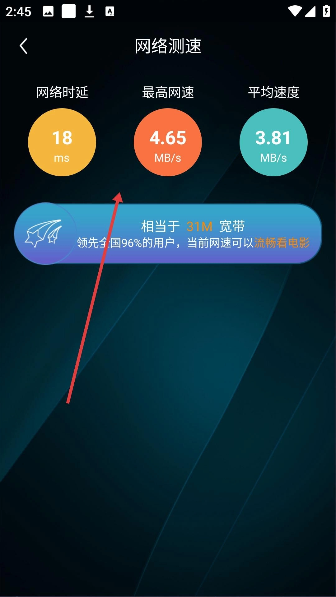 测速结束后,要是对结果不太满意,你可以点击返回箭头,回到测速的初始界面,然后重新点击开始测速按钮,再次进行网络速度的检测。