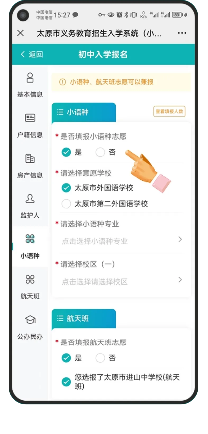 小语种航天班——若您打算填报小语种,烦请选择“是”,并完成小语种专业、校区等相关信息的选择。