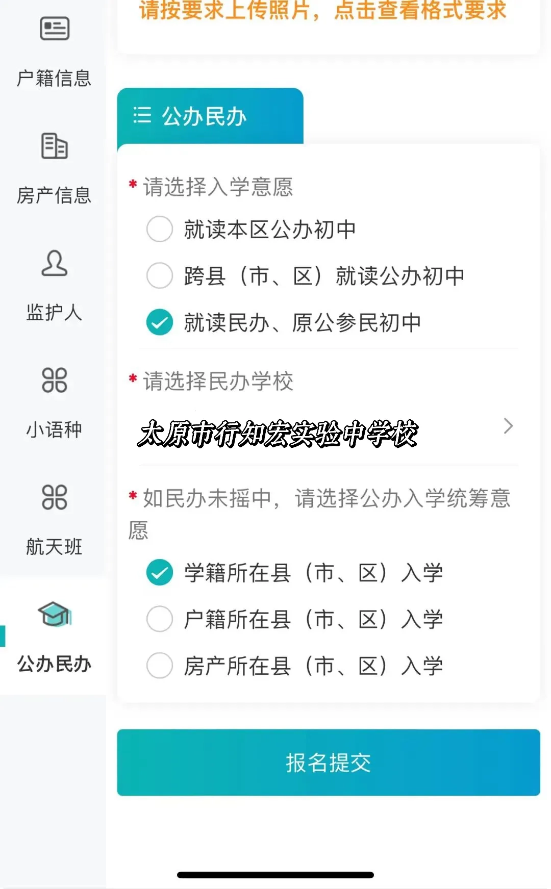 找到【民办学校和原公参民学校】这个选项并点击,接着在“民办志愿选择”的界面里,选中“太原市行知宏实验中学校”。完成这一步后,点击“入学意愿”选项,再按照系统给出的提示,把剩下的相关信息填写完整。