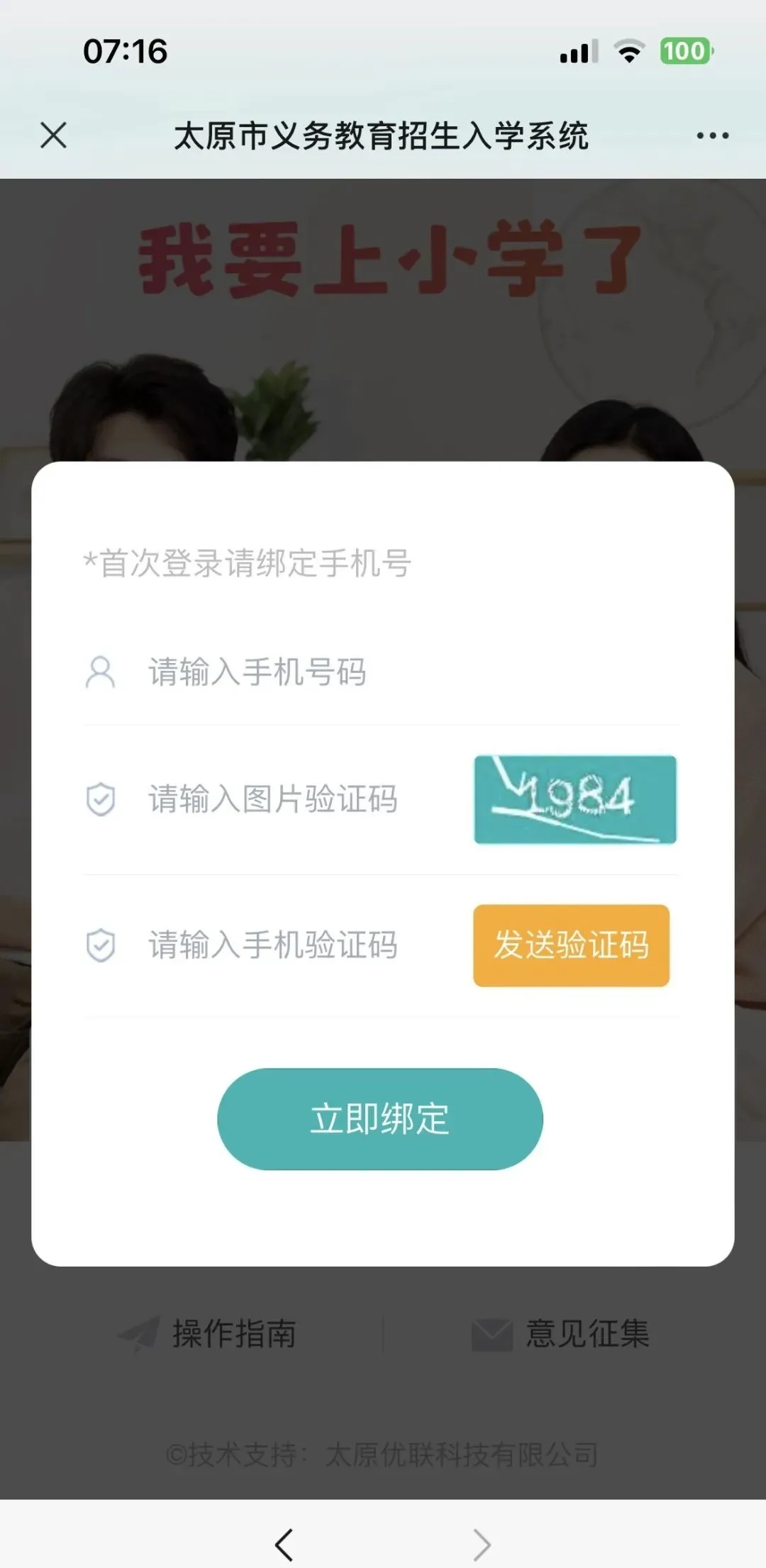 首次登录需输入监护人手机号、验证码。