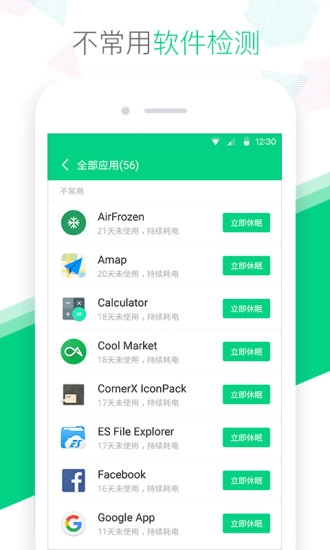 智能休眠功能:绿色空间可智能识别后台不常用的应用并使其进入休眠状态,这样能有效避免应用自行启动和不必要的电量消耗,从而帮助延长手机电池的使用寿命。