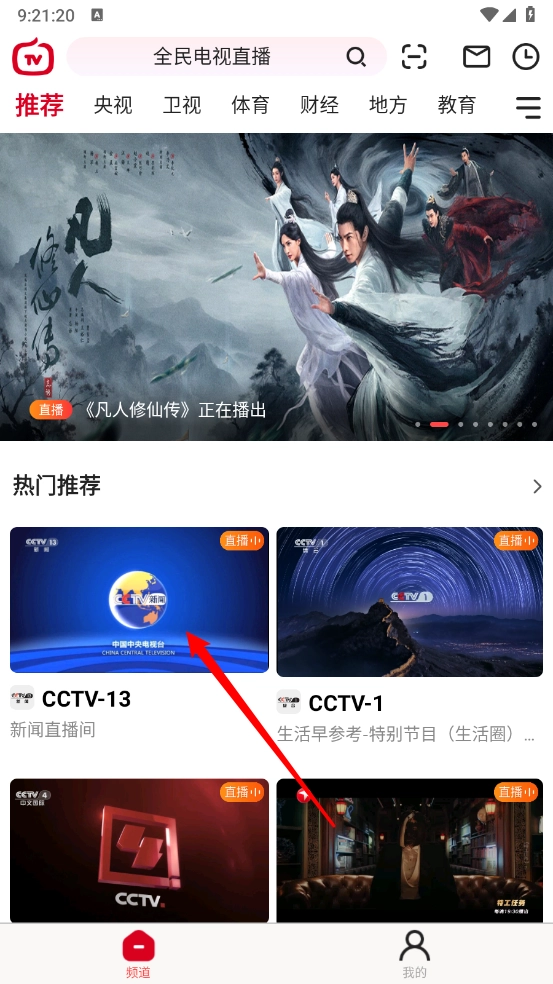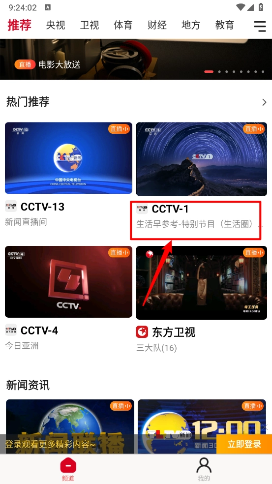 打开软件,在频道页面选择所需观看的直播资源。