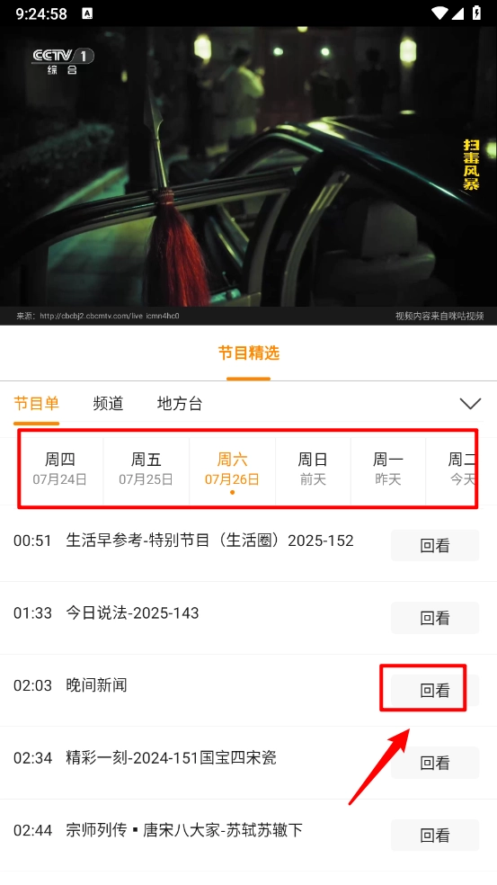 接着滑动选择需要回看的日期和节目表,点击右侧的“回看”按钮就可以了。