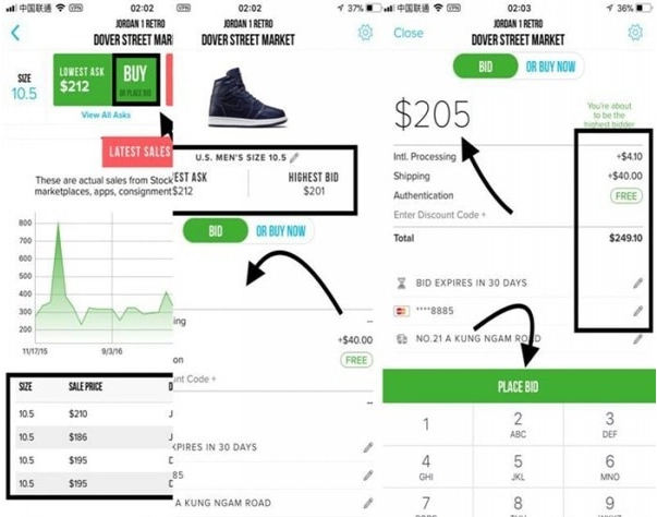 进入购买环节后,点击“BUY”按钮,就能依据价格走势进行出价。这时界面会提示出价是否偏低,也可以直接以当前的最低报价(Lowest Ask)购入,系统会自动核算运费与总金额。确认信息无误后,点击“PLACE BID”,接下来只需等待卖家接受出价即可。