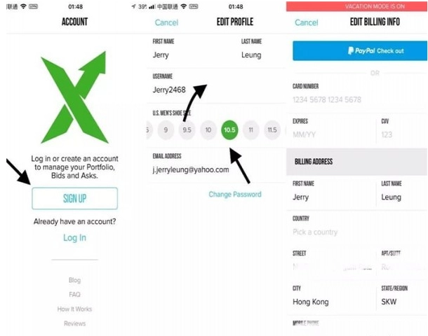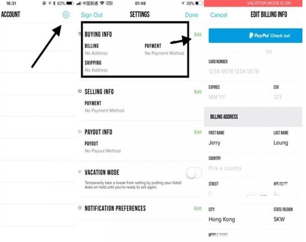 账户启用后,点击右上角进入设置界面,接着打开BUYINGINFO来设置付款方式和填写收货地址。目前StockX支持PayPal与国际信用卡付款;尽管支持直邮国内,但存在被海关征税的可能性,因此建议选择在香港设有自取点或采用邮政清关模式的转运公司,也可以将商品寄到香港亲戚朋友的地址,之后再从香港人肉带回。