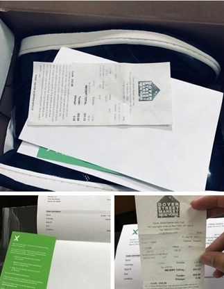 鞋盒里除了鞋子,stockx还会附带发票和宣传卡,宣传卡上写着让顾客拍一张鞋子和鉴定标签同框的照片,发布到社交网站上,就有机会被他们转发的活动;另外鞋盒里还有一张疑似卖家从Dover Street Market购买这双鞋的发票。