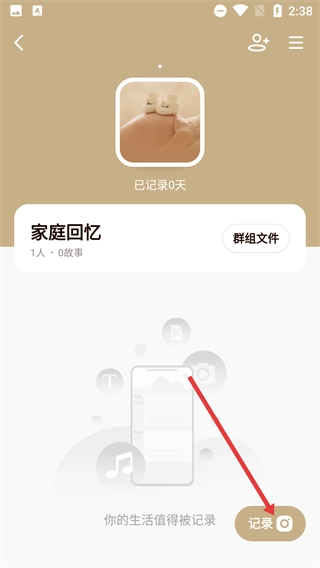 在群组详情页面,点击【记录】按钮,即可进入“写故事”的内容编辑界面。