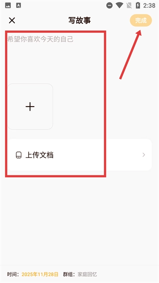 在撰写故事的页面中,输入文字内容并添加图片、文档等素材后,点击【完成】按钮,即可完成该群组下的内容记录工作。
