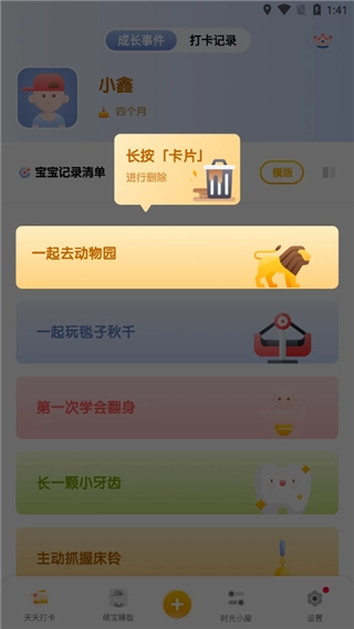 和宝贝一起定下成长的小目标,让每天都充满仪式感;打卡记录一键就能查询,还能自动生成回忆相册,照片也能秒变视频。
