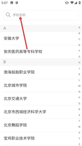 在【学校名称】搜索界面,可通过搜索框输入内容,也能直接选择列表里的学校,像【安徽大学】-【安庆医药高等专科学校】这类都包含在内。