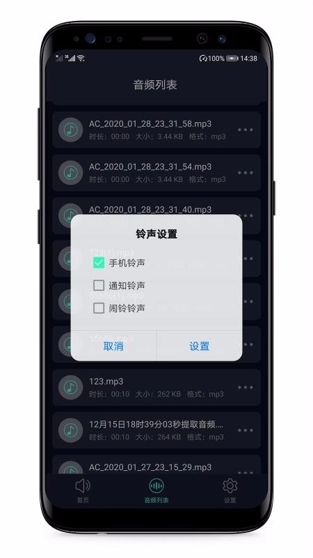 手机版语音备忘录支持将声音设置为来电铃声,选定铃声设置选项后,可通过播放铃声来完成设定操作。