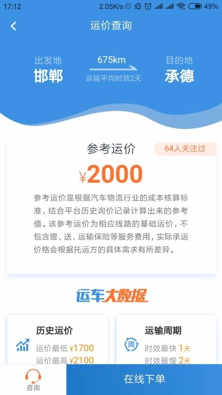 用户在软件里输入起点与终点的位置信息后,点击查询按钮,即可获取运输价格。