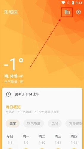 首先要进入几何天气的首页,找到设置左边的图标,然后点击该图标。