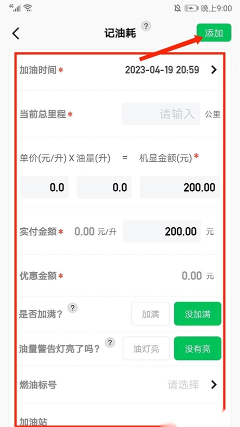 在记录油耗的界面里,按顺序填写【加油时间】等相关信息,接着点击右上角的【添加】选项。