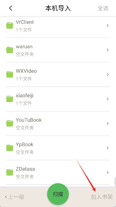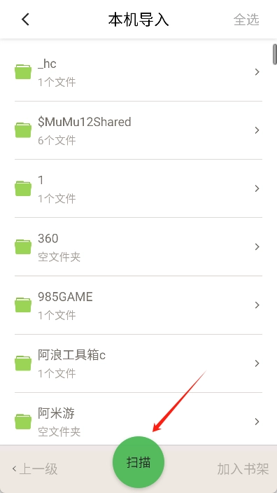 在导入页面点击下方的“扫描”按钮,系统就会自动扫描手机里存储的全部书籍。