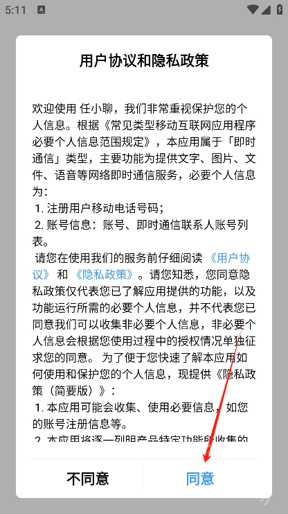 首先前往魔趣网(m.mfunz.com)安装任小聊的新版本,之后点击“同意”按钮进入软件。