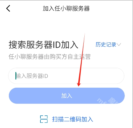 在接下来的界面里输入“服务器ID”,然后点击“加入”按钮。另外,也能选择点击下方的“扫描二维码加入”选项。