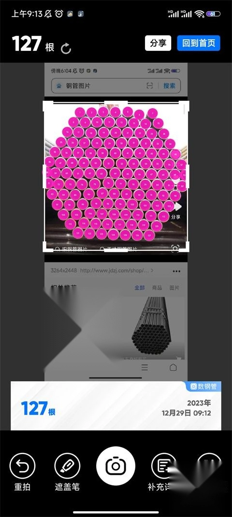 遗漏补充功能:若存在未统计的钢管,可点击遗漏的钢管,此时会出现红色亮点,随后点击下方对应数字进行添加,以此确保计数完整无误。
