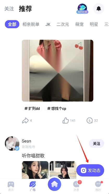 进入广场页面后,点击页面右下方的“发动态”按钮。