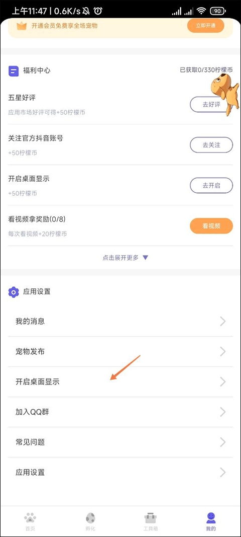 在个人界面的应用设置里,找到并点击【开启桌面显示】这个选项。