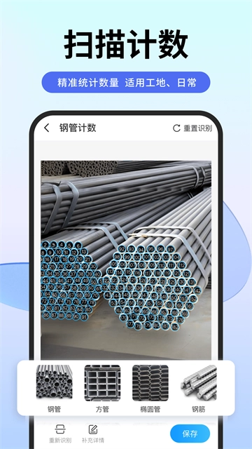 【扫描计数】您可以先选择计数类型,接着通过拍摄或导入图片的方式进行扫描计数,该功能支持对多种物品进行计数。