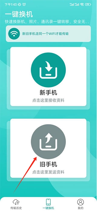 我们先在手机上下载安装一键换机应用,打开该应用后,选择“旧手机”选项来开启发送模式。