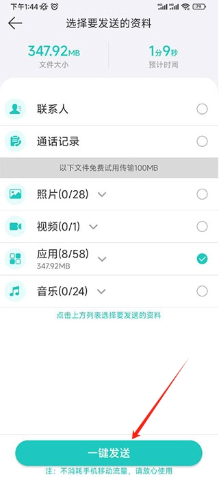 选定内容后,点击“一键发送”按钮,系统便会启动数据传输的准备工作。