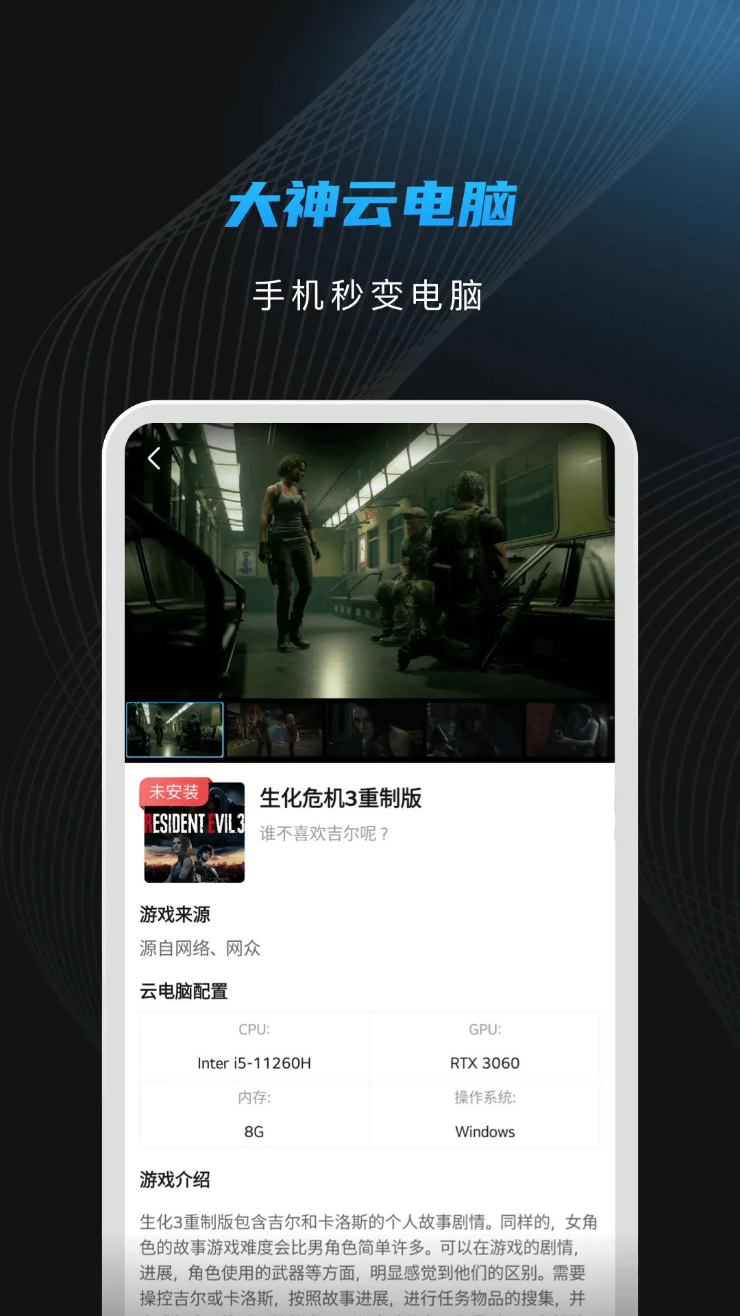 大神云电脑作为一款手机云游戏平台,用户在手机上安装其新版本后,就能实现用手机玩PC游戏的功能。目前,该平台已支持《黑神话:悟空》《炉石传说》《龙之谷》等热门游戏,即便玩家没有高性能的硬件设备,也可以享受到画面稳定在60帧的流畅游戏体验。