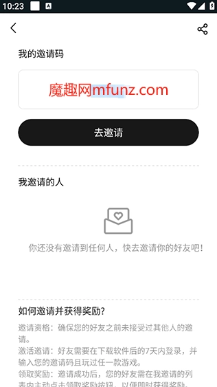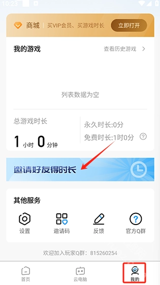 在大神云电脑的【我的】页面里,点击【邀请好友得时长】这个选项。