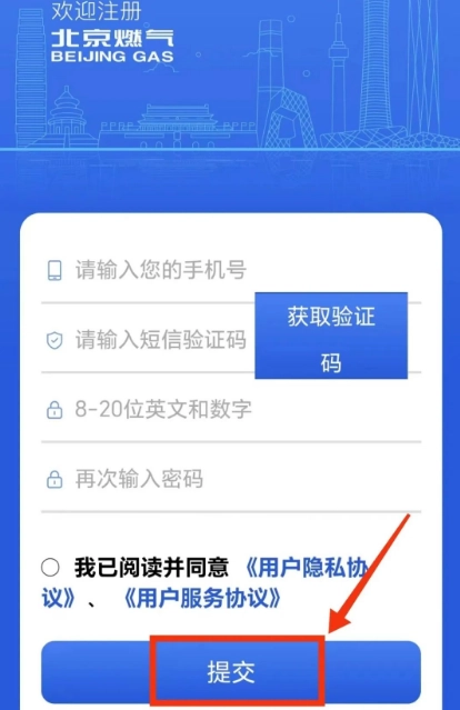 打开北京燃气应用,找到并点击【快速注册】按钮,依次输入所需的相关信息,确认无误后点击【提交】按钮即可。