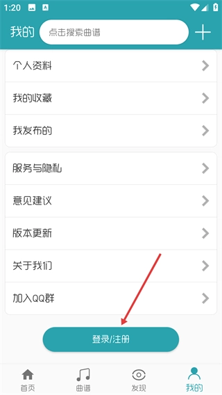 在搜谱首页点击右下角的【我的】按钮,即可进入个人中心页面。