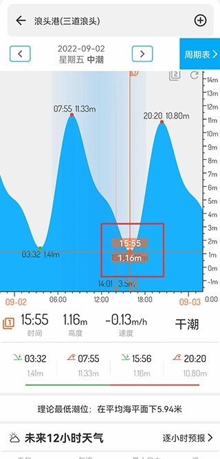 点击进入后,你会看到当天的涨潮时间,其中红色代表涨潮,绿色代表退潮。